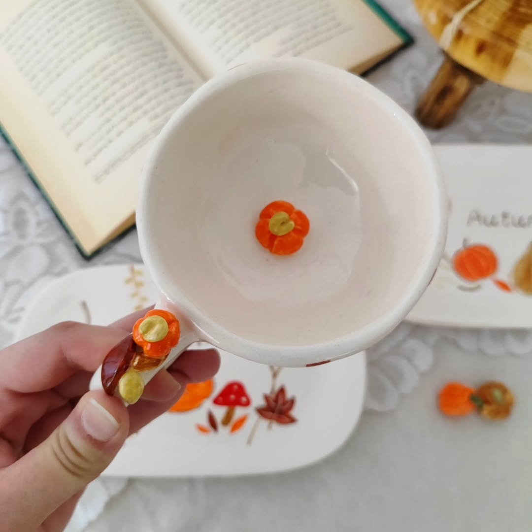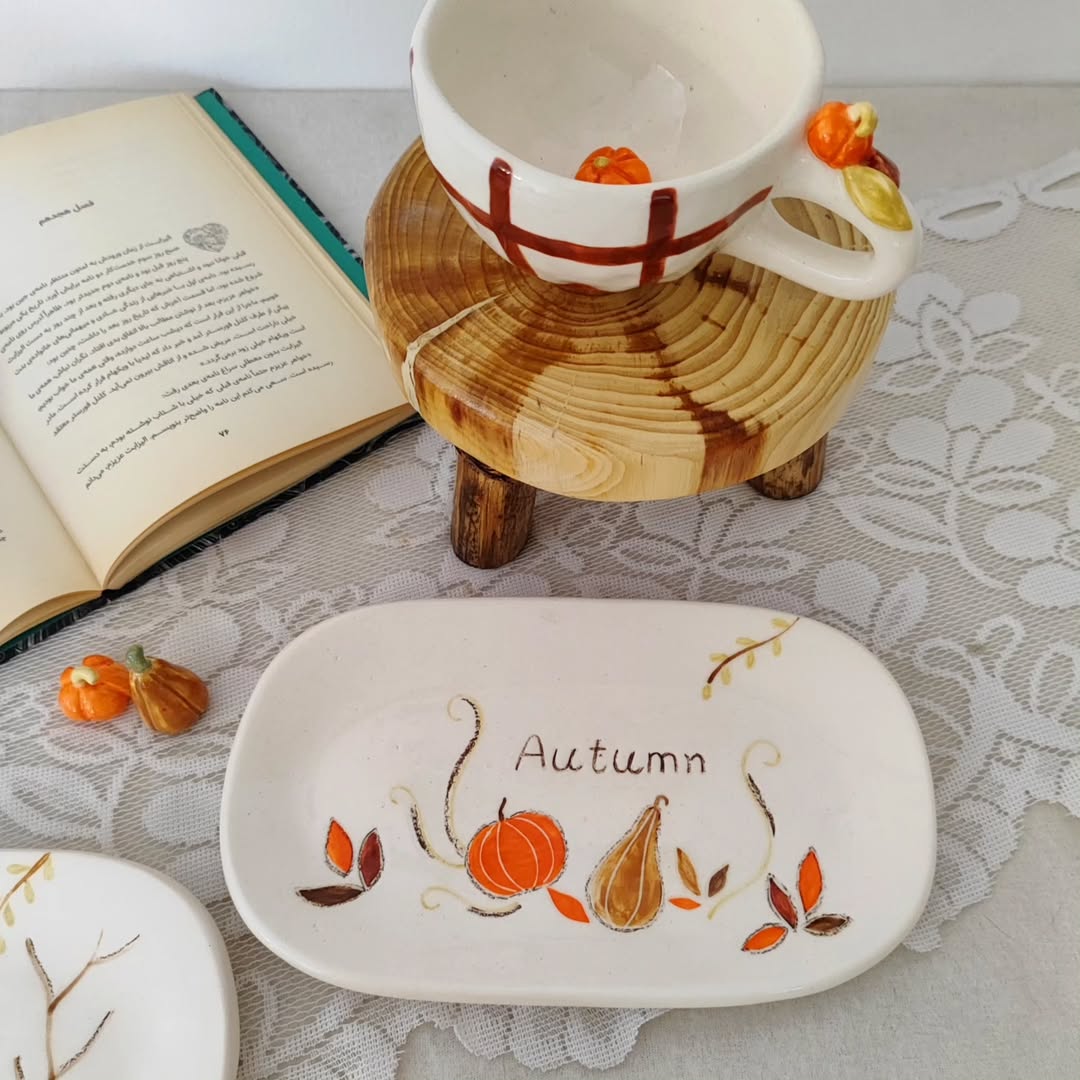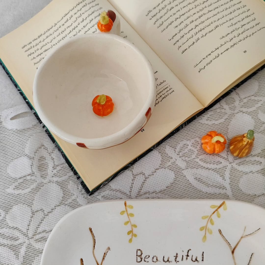 ست فنجان و بشقاب دست ساز از جنس سرامیک، لعاب بدون سرب کاملاً قابل استفاده و شستشو.